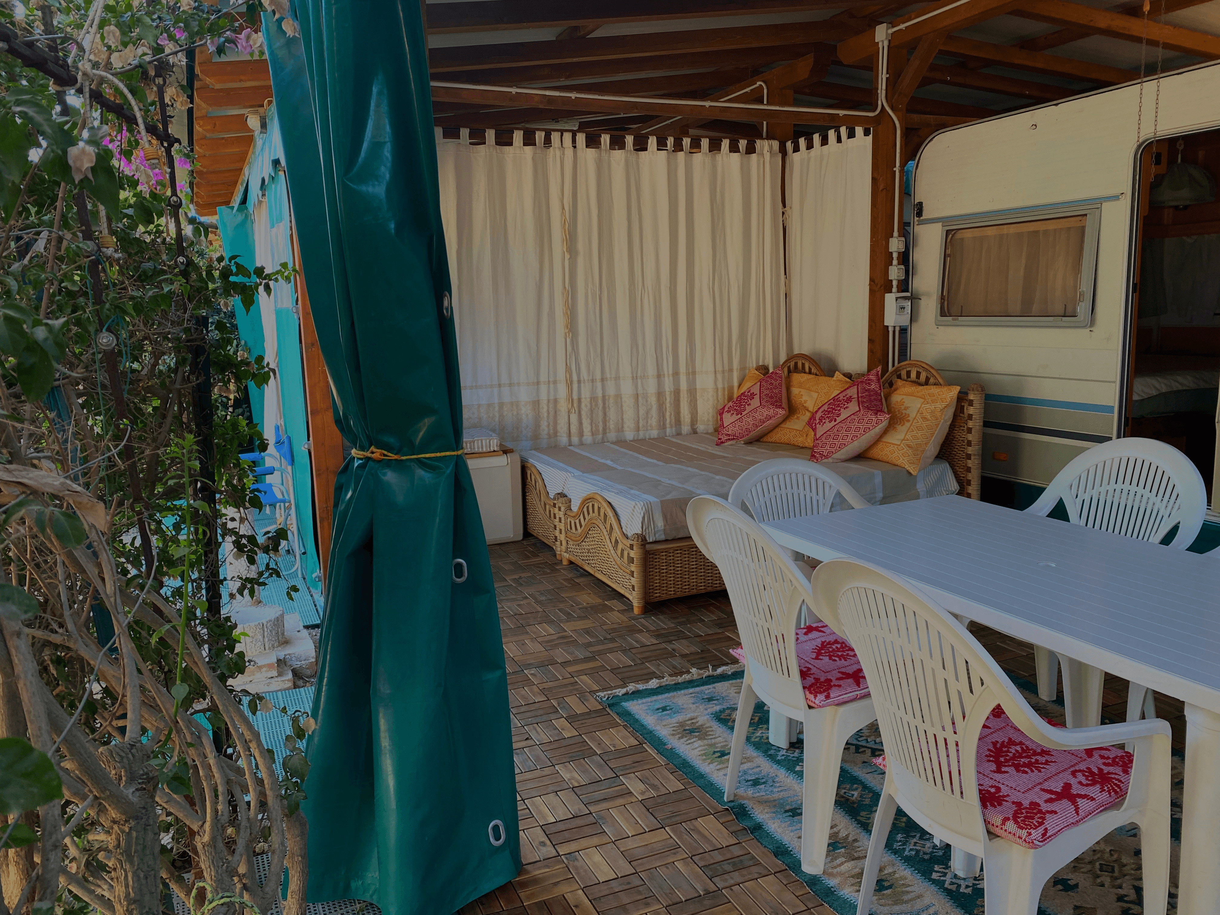 La zona notte vi accoglie con una grande roulotte di 8x3m, dotata di 5 comodi posti letto, condizionatore e riscaldamento per garantirvi il massimo comfort in qualsiasi stagione.